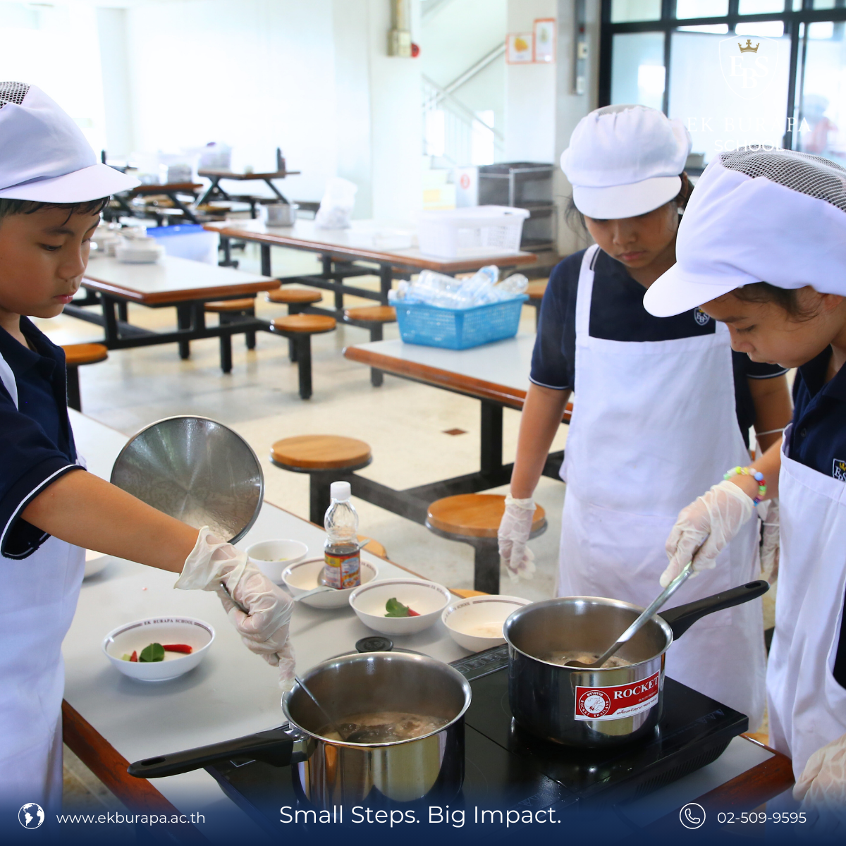 นักเรียนได้ลงมือทำเมนู “ต้มยำไก่” เพื่อฝึกทักษะชีวิตที่สำคัญ เช่น การวางแผน การแบ่งหน้าที่ การทำงานร่วมกัน และการประกอบอาหารอย่างถูกสุขลักษณะ