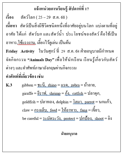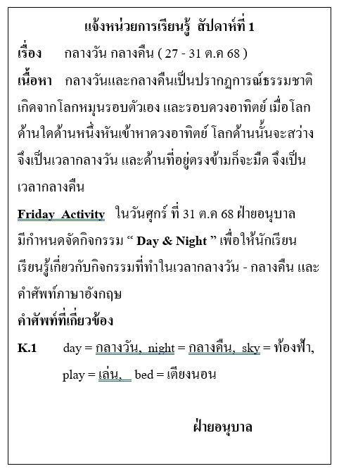 | คณิตศาสตร์ | – ท่องสูตรคูณแม่ 2 – 9 และท่องสูตรการหาพื้นที่สี่เหลี่ยมให้ผู้ปกครองฟัง |
